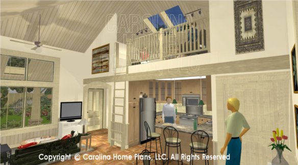 We originally designed this small stone bungalow house plan for 2 couples who decided to pool their resources in order to build their dream vacation home. Neither couple could afford a get-away cottage individually, so sharing a comfortable and unique vacation home on a small lot near the water made financial sense. We created enough private space with a cozy loft and a spacious, open and bright cathedral great room for maximum enjoyment, allowing both couples to vacation together comfortably.